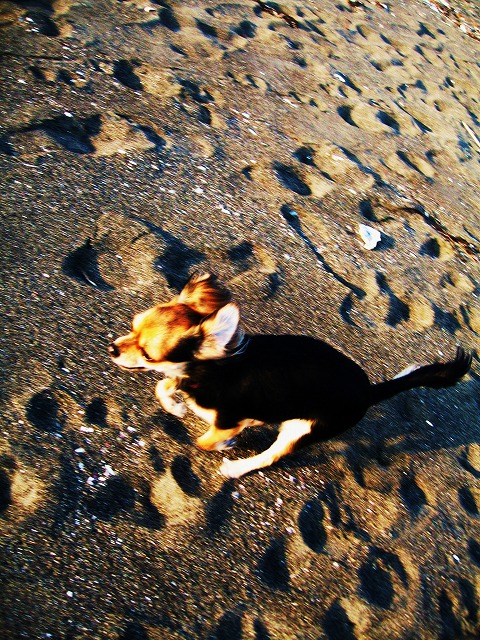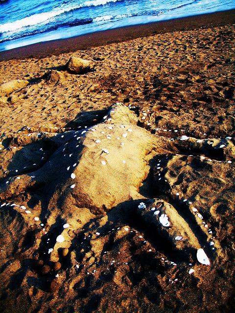 朝の小粒の散歩で、砂浜に子供達が砂で作った沢山のアートがあり、楽しませてもらった。